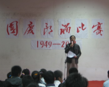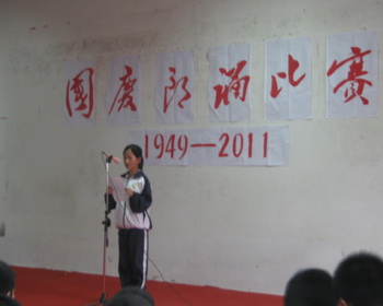 经过精心的策划和认真的准备,25名选手经过预赛激烈的角逐而最终闯进了决赛。决赛中,朗诵者满怀真挚情感,用抑扬顿挫的语调描述了新中国62年来的光辉历程;用最优美的语言,为我们伟大的祖国62岁华诞献上美好的祝福,祝愿我们伟大的祖国繁荣昌盛,祝愿我们伟大的祖国国泰民安。他们声情并茂的精彩朗诵感染了在场的每一个人,赢得了台下阵阵掌声与喝彩声。