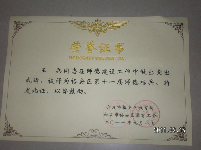 王兵老师荣获“裕安区第十一届师德标兵”光荣称号。