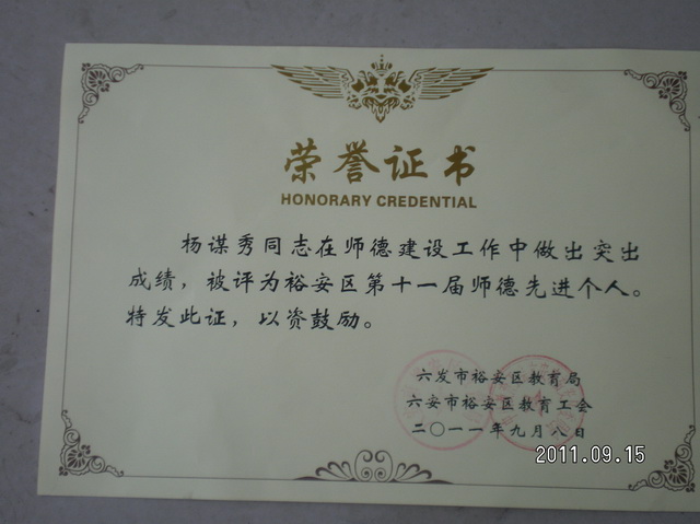 杨谋秀老师荣获“裕安区第十一届师德先进个人”光荣称号。