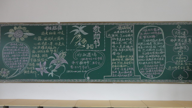 为了把这期黑板报变成教师节当天献给老师们的礼物,孩子们充分利用自己的课余时间精心收集了资料,并且明确了各自的分工:他们中有的负责版面设计、有的负责图案描绘、有的负责文字抄写……。在大家的共同努力,终于在在教师节之前把本班的黑板报出好了。多数班级的板报还设计精巧、图文并茂,表达出了对老师的深深的谢意。“谢谢您,老师”、“感谢师恩”、 “老师,您辛苦了”等等语言都把发自肺腑的尊师爱师之情酣畅的表达了出来,检查过后,学校还对各班级的板报进行了评奖和奖励。