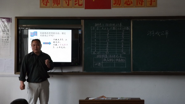 5月16日上午,江家店镇中心小学举行了数学示范教学,这课由教导主任张继刚执教。张主任采用新颖,灵活的教学方法充分调动学生参与的积极性,以富有趣味性的故事引领学生学习《游戏公平》这一内容,让学生自己通过实际操作来探索知识,极大地提高了课堂教学的效果。整节课思路清晰,条理清楚,课堂板书和教案设计受到了大家一致好评。